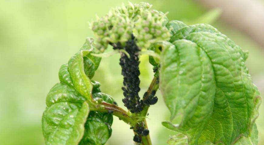 Черная калиновая тля-листокрутка – мелкое насекомое длиной до 7 мм. Из зимующих яиц при распускании листьев появляются личинки. Они активно размножаются, питаясь соком растения. Листья закручиваются, деформируются и засыхают.